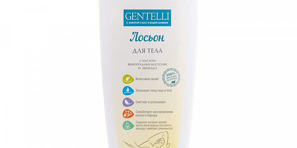 Лосьон для тела Gentelli с маслом виноградных косточек и авокадо интенсивно питает, смягчает, успокаивает, увлажняет кожу лица и тела. Рекомендован для ухода за длительно лежачими больными, проведения массажных процедур, после посещения бассейна, солярия, сауны. Применимо для всех типов кожи, в том числе для сухой чувствительной и зрелой кожи.